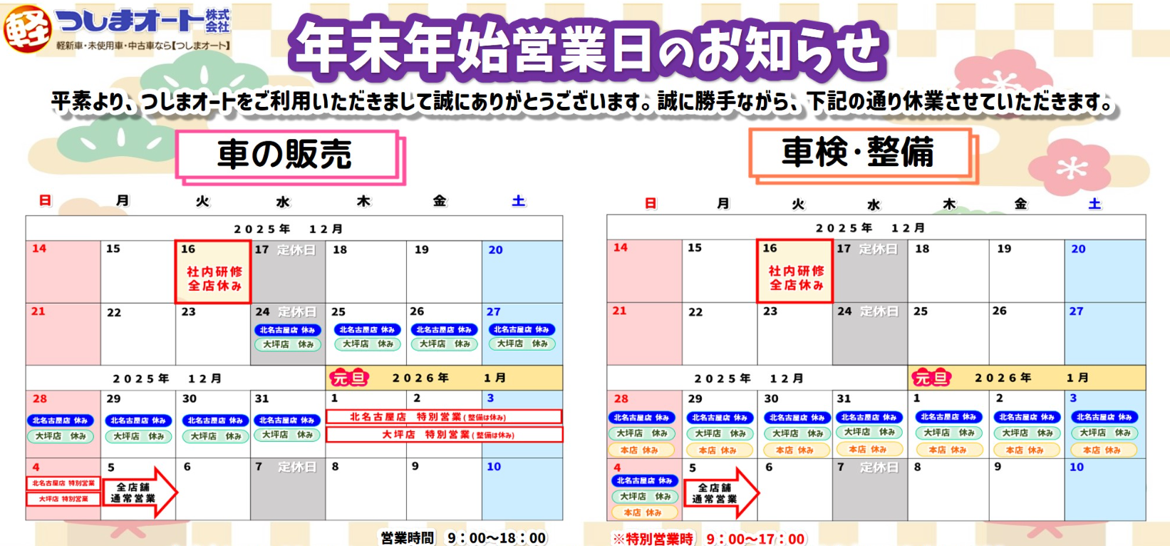 カーディーラーと違い、車を販売する為の営業マンの人件費や折込みチラシ等の費用がかかっていない為、その費用分を 津島市・愛西市・あま市・稲沢市・清須市・弥富市・名古屋市(中村区・中川区)・海部郡(大治町・飛鳥村・蟹江町)・海津市エリアのお客様に還元し、格安提供!